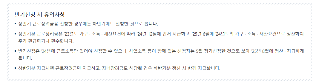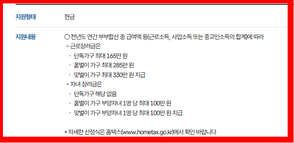 이외에도 자녀장려금과 함께 신청한 경우 근로장려금 지급금액이 추가될 수 있으며, 세부 금액은 총소득과 재산 수준에 따라 달라집니다.