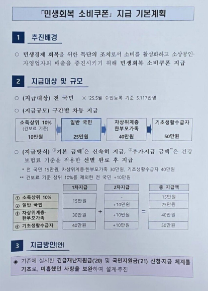 정부는 경기침체 극복과 소비 진작을 위해 민생회복소비쿠폰을 전국민에게 지급하기로 결정했습니다.