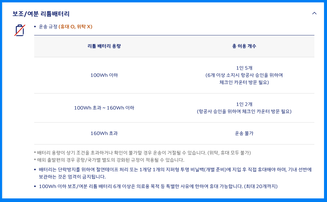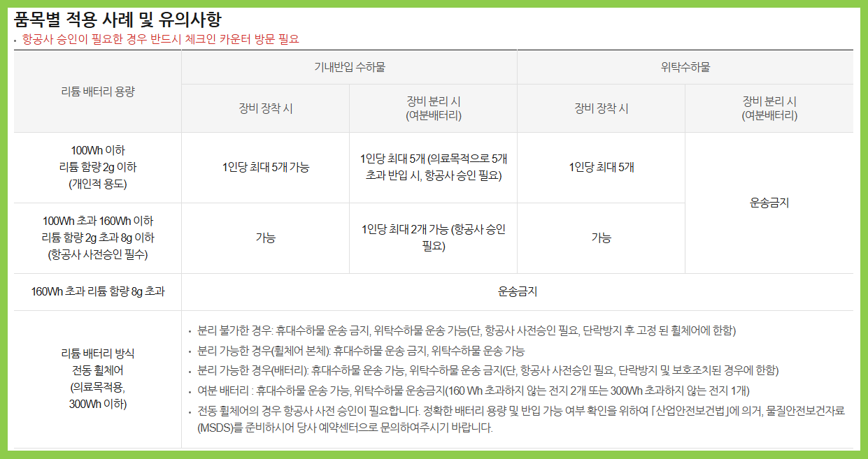 - 100~160Wh: 사전 승인 필요, 최대 2개
