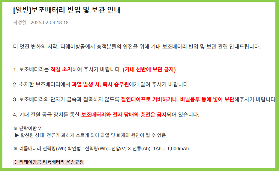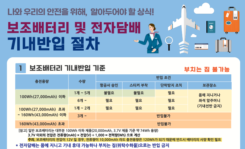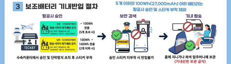 - 보조배터리 기내반입은 100Wh 이하 + 표기 필수