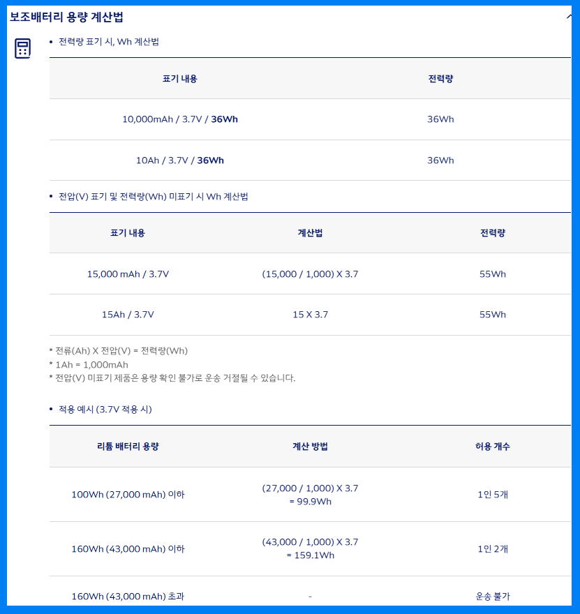- 대부분 100Wh 이하만 보조배터리 기내반입 허용