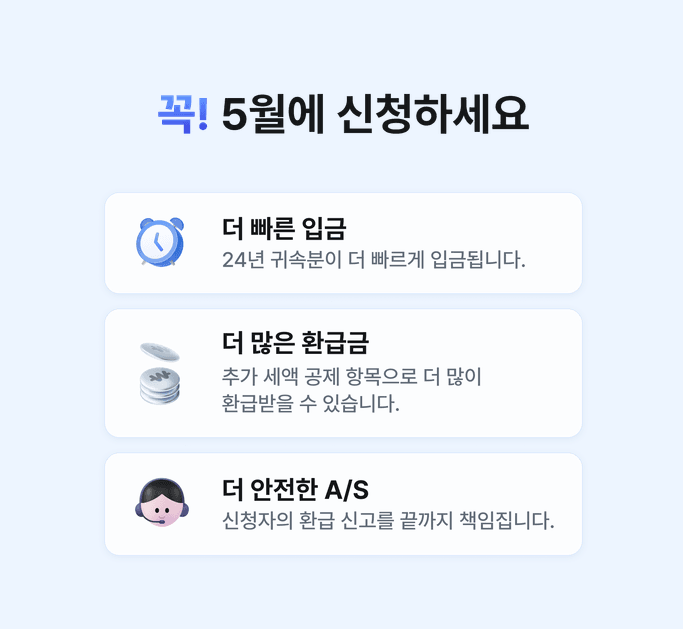 | 장점 | 빠르고 정확한 환급, 서류 작성 無 |