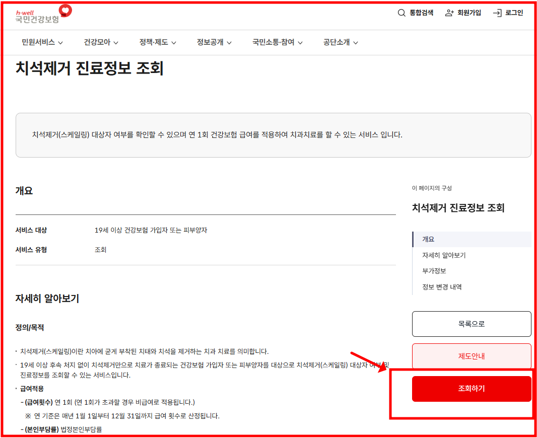 - "건강관리 → 민원서비스 →치석제거 진료정보 조회