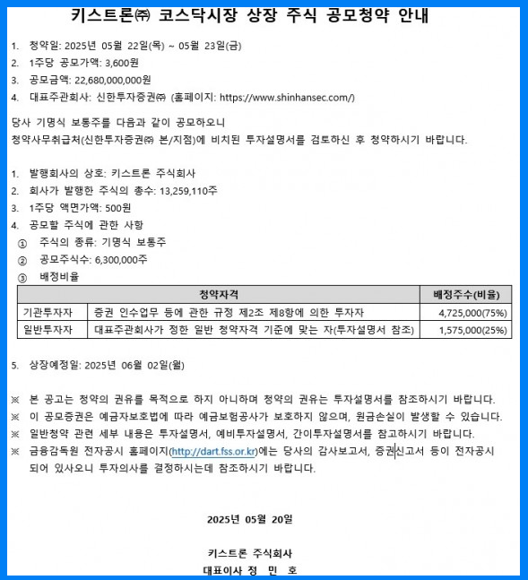 키스트론 수요예측결과는 1,140.95:1이라는 기록적인 경쟁률과 공모가 상단 확정이라는 성과를 냈습니다. 청약일은 5월 22~23일이며, 상장일은 6월 2일 예정입니다. 실적형 상장 기업 중에서도 투자 접근성이 높고, 분산 투자 전략이 추천됩니다.