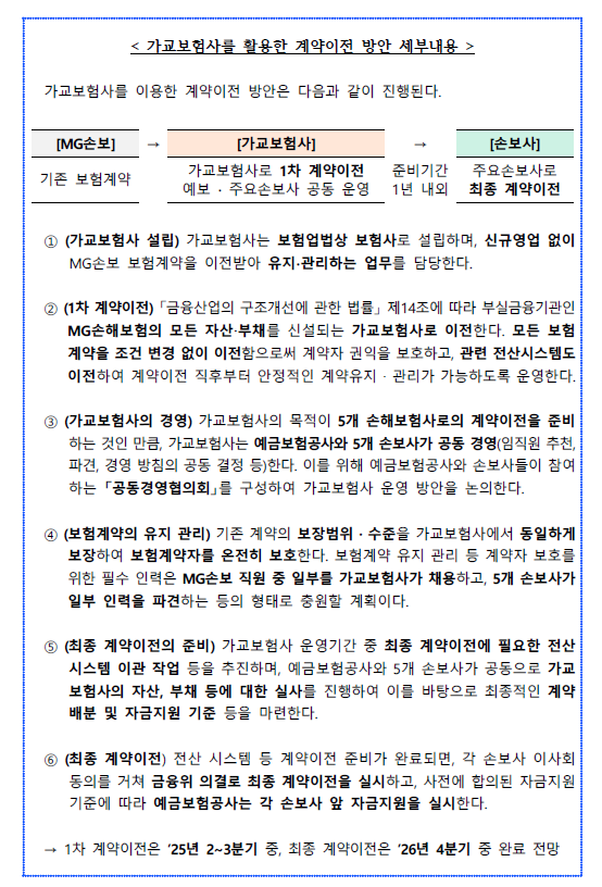 MG손해보험이 보유한 모든 보험 계약은 삼성화재, 현대해상, DB손보, KB손보, 메리츠화재 등 5대 대형 손해보험사로 이전됩니다.